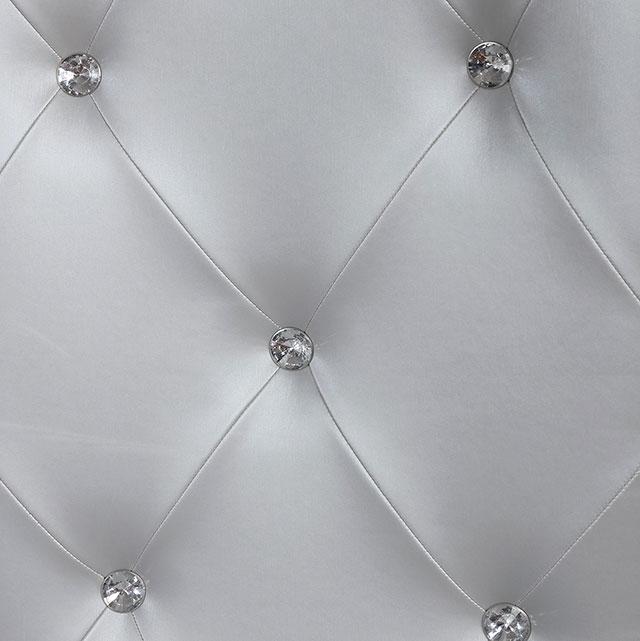 Alena Silver Dining Table, 84"(66"+ 1 X 18" LEAF)L X 42"W X 30"H, 231lbs. Shine and polish your dining room for pure glamour. Tempered glass and mirrored panels create a sophisticated elegance while the silver finish molds the details together for a luxurious dining set. Light up your prized collectibles in the glass-encas ed curio while the bar table provides a convenient space to concoct the perfect cocktail and store all your barware. Rest upon tufted leatherette chairs and sink into soothing comfort with its dense foam cushions. The expansive table completes the se t, offering spacious room for six and carved tapered legs that steadily support the design. Features: Contemporary Style 18" Expandable Leaf 5mm Tempered Glass & 5mm Mirror Padded Leatherette Chairs Button Tufted Matching Curio Solid Wood, Wood Veneer, Others Silver Finish